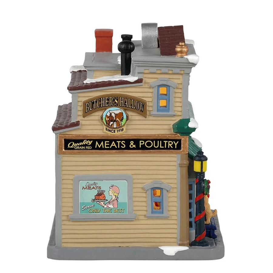 Butcher’s Hollow appartiene alla collezione Lemax 2021 e fa parte del tema Lemax Caddington Village. Butcher’s Hallow è il miglior macellaio della città. Davanti all’edificio c’è una panchina blu, su cui un cucciolo è salito per guardare attraverso la finestra anteriore. Attraverso la finestra, puoi vedere l’indaffarato macellaio. Le numerose insegne dell’edificio pubblicizzano carni, pollame e salumi di qualità. Tutto è fatto in casa, come puoi vedere dall’affumicatoio sul lato dell’edificio.