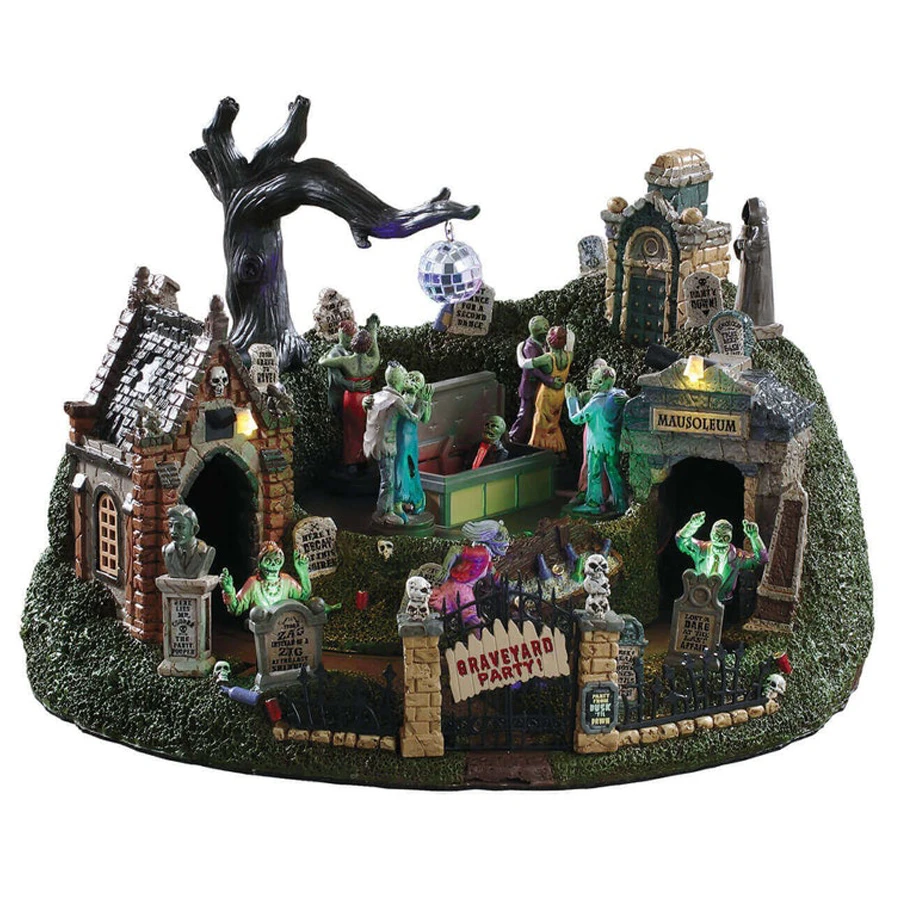 Graveyard Party fa parte del tema Lemax Spooky Town. Al cimitero cittadino è in corso una festa! Gli zombies escono dalle loro tombe e raggiungono i ballerini che volteggiano già sulla pista da ballo. L’atmosfera è spaventosamente ‘festosa’ con la palla strobo e il trenino di zombies!
