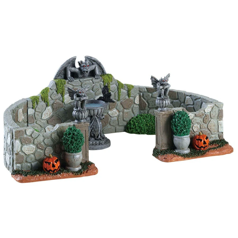 Grey Gargoyle Gardens, Set of 6 fa parte del tema Lemax Spooky Town. Voglia di un giardino tranquillo? Forse questo non fa per te…. I muri in pietra che sembrano chiudersi a morsa, le zucche intagliate con volti diabolici e i gargoyles appostati ovunque rendono questo giardino veramente inquietante.