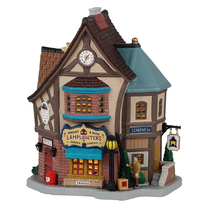 Wright & Sons Lamplighters appartiene alla collezione Lemax 2021 e fa parte del tema Lemax Caddington Village. La Wright and Sons Lamplighters Service Company si trova in Lumens Lane. Questo edificio ha tre diversi stili di tetto e la sua struttura è fatta di stucco, legno e mattoni. Fuori, un operaio sta montando una scala per riparare un lampione a gas. A terra, ci sono forniture di lampade, tra cui un barile di petrolio.